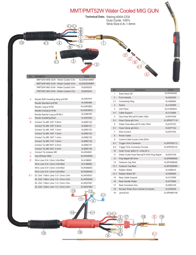 Мощная сварочная горелка с жидкостным охлаждением PMT52W (500 А/ 100 %) для полуавтоматической сварки MIG/MAG.